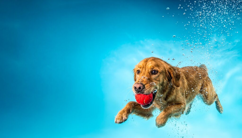 Eine Tierfotografin, die professionelle Unterwasseraufnahmen von Hunden anbietet, hat ein Bild erstellt und nachbearbeitet, das einen Hund unter der Wasseroberfläche zeigt, wie er nach einem roten Spielzeug schnappt. Das Foto besticht durch seine realistische Dynamik, die durch bewusst getroffene Entscheidungen bezüglich Ausschnitt, Perspektive, Belichtung und Schärfe erzielt wurde.